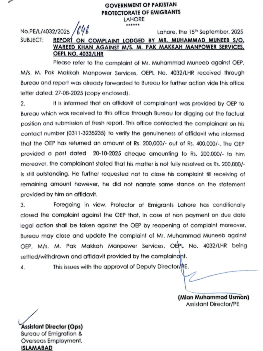 OEP Name: M/s.M. Pak Makkah Manpower Services