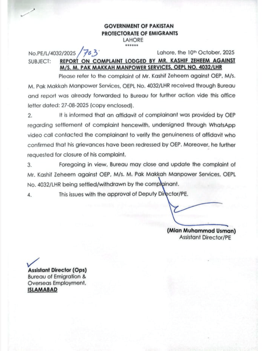 OEP Name: M/s.M. Pak Makkah Manpower Services