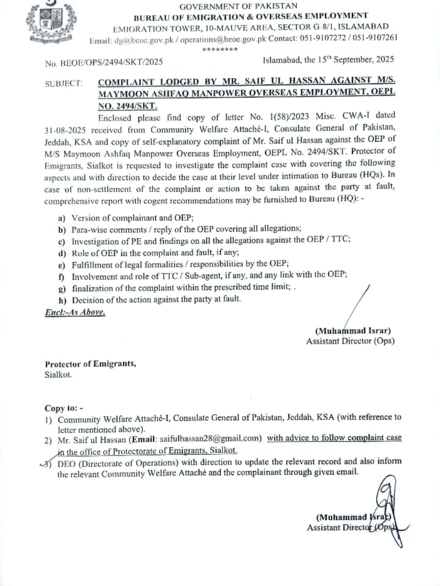 OEP Name: Maymoon Ashfaq Manpower Overseas Employment