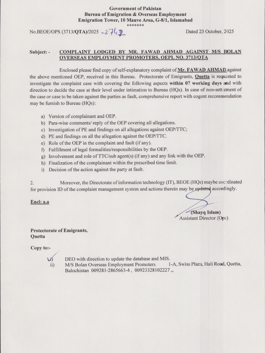 OEP Name: M/s.Bolan Overseas Employment Promoters