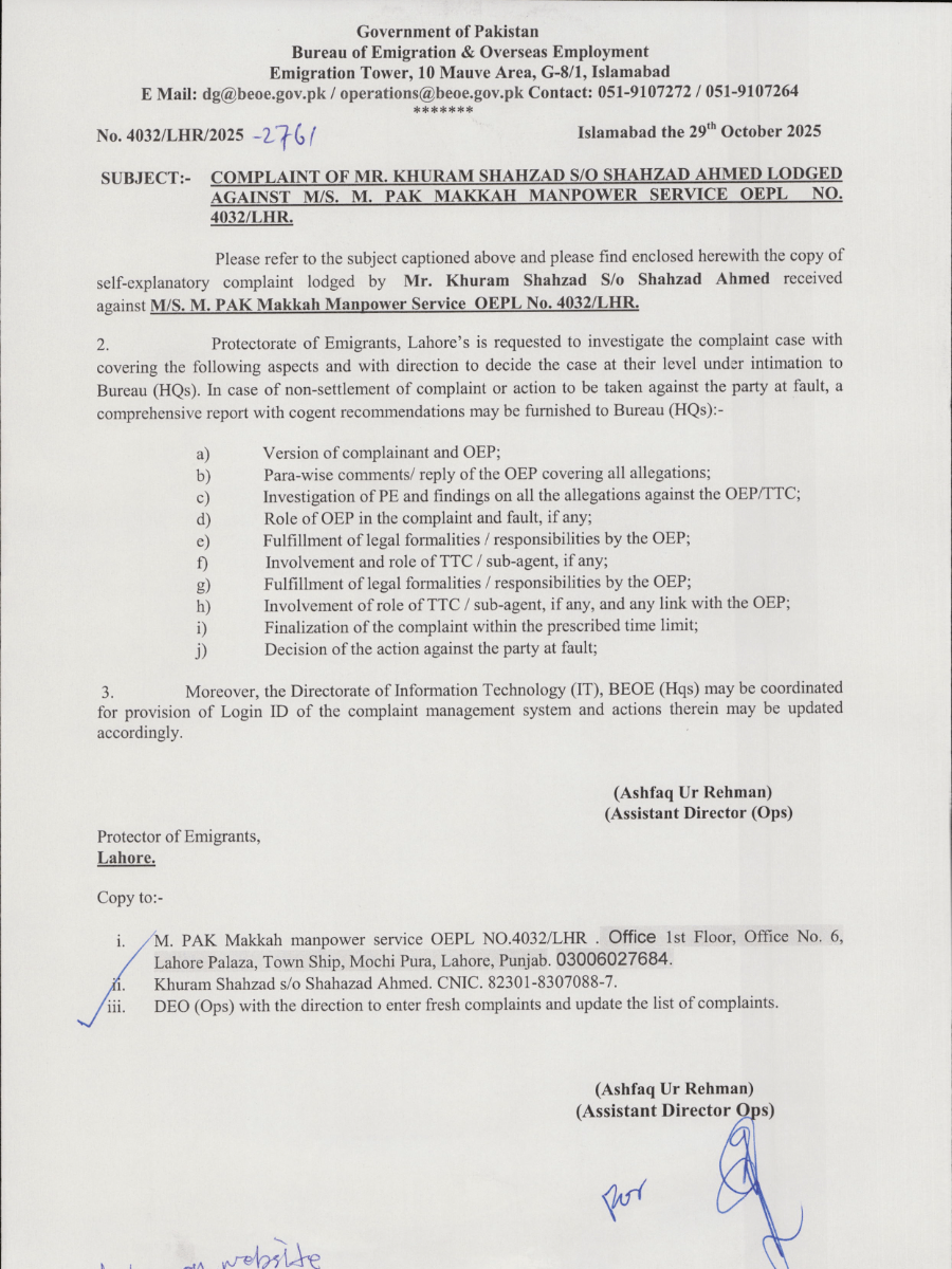 OEP Name: M/s. M. Pak Makkah Manpower Services,
