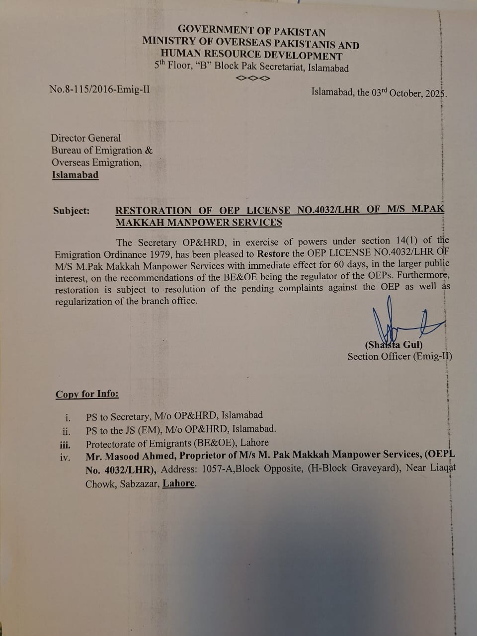 Restoration of OEP License No. 4032/LHR of M/s. M. Pak Makkah Manpower Services Oct 14, 2025