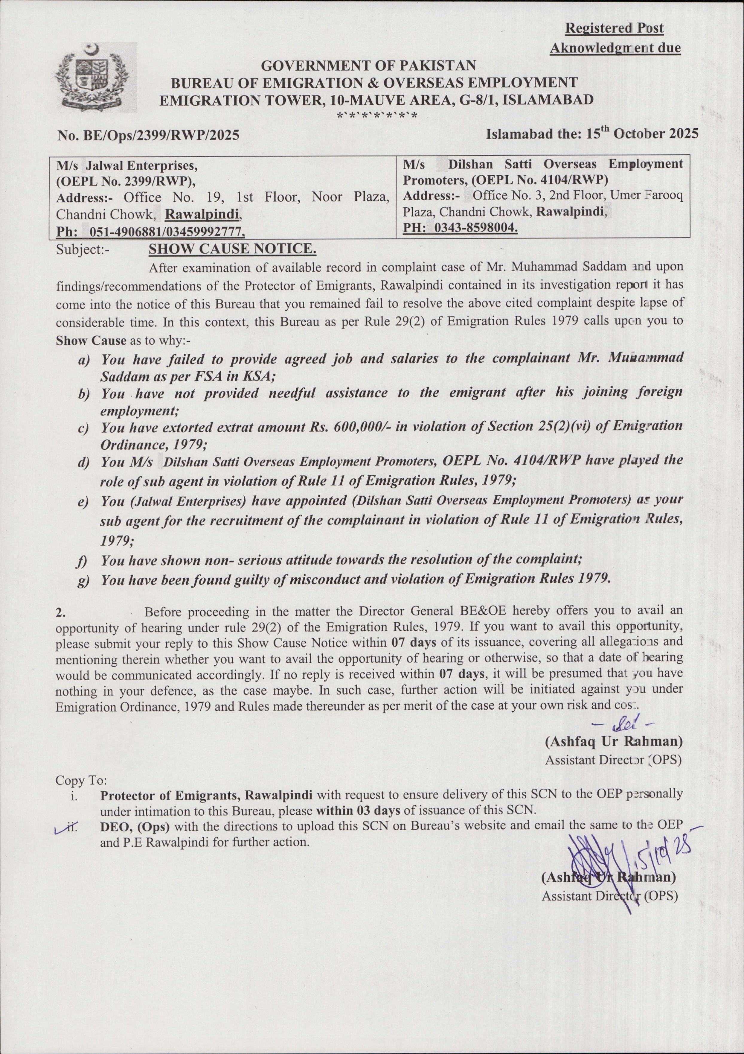 Show Cause Notice To M/s. Jalwal Enterprises,OEPL No.2399/RWP & M/s. Dilshan Satti Overseas Employment Promoters,OEPL No.4104/RWP