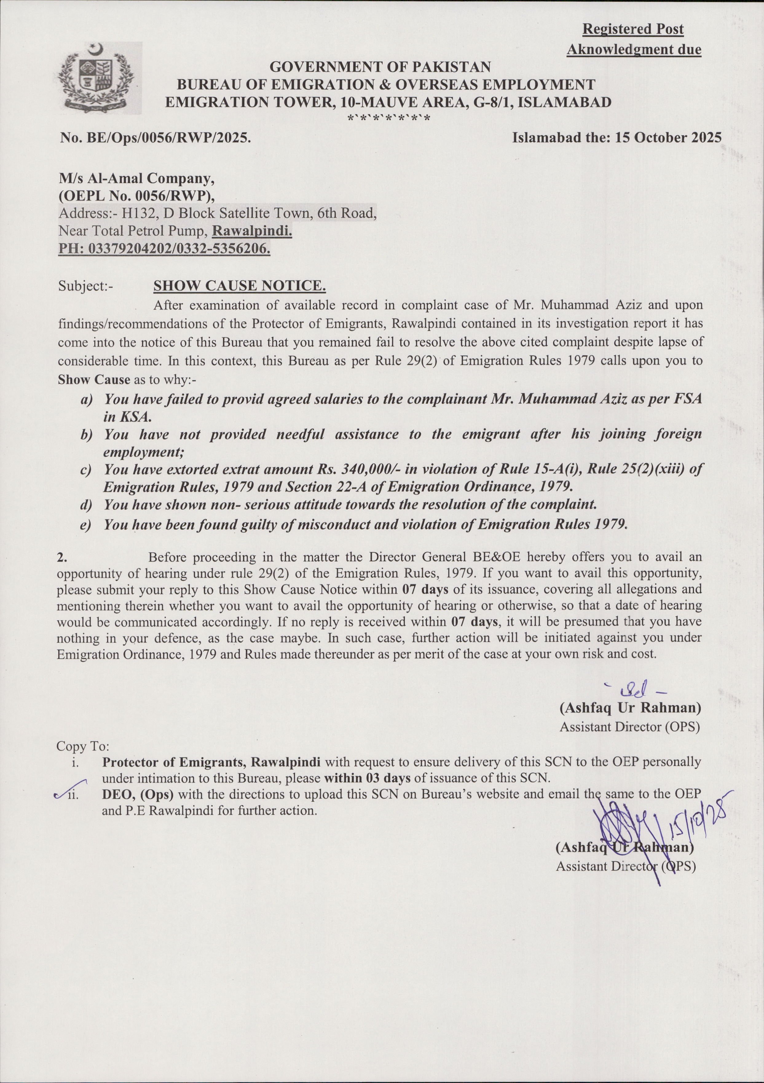 Show Cause Notice To M/s.Al-Amal Company,OEPL No.0056/RWP