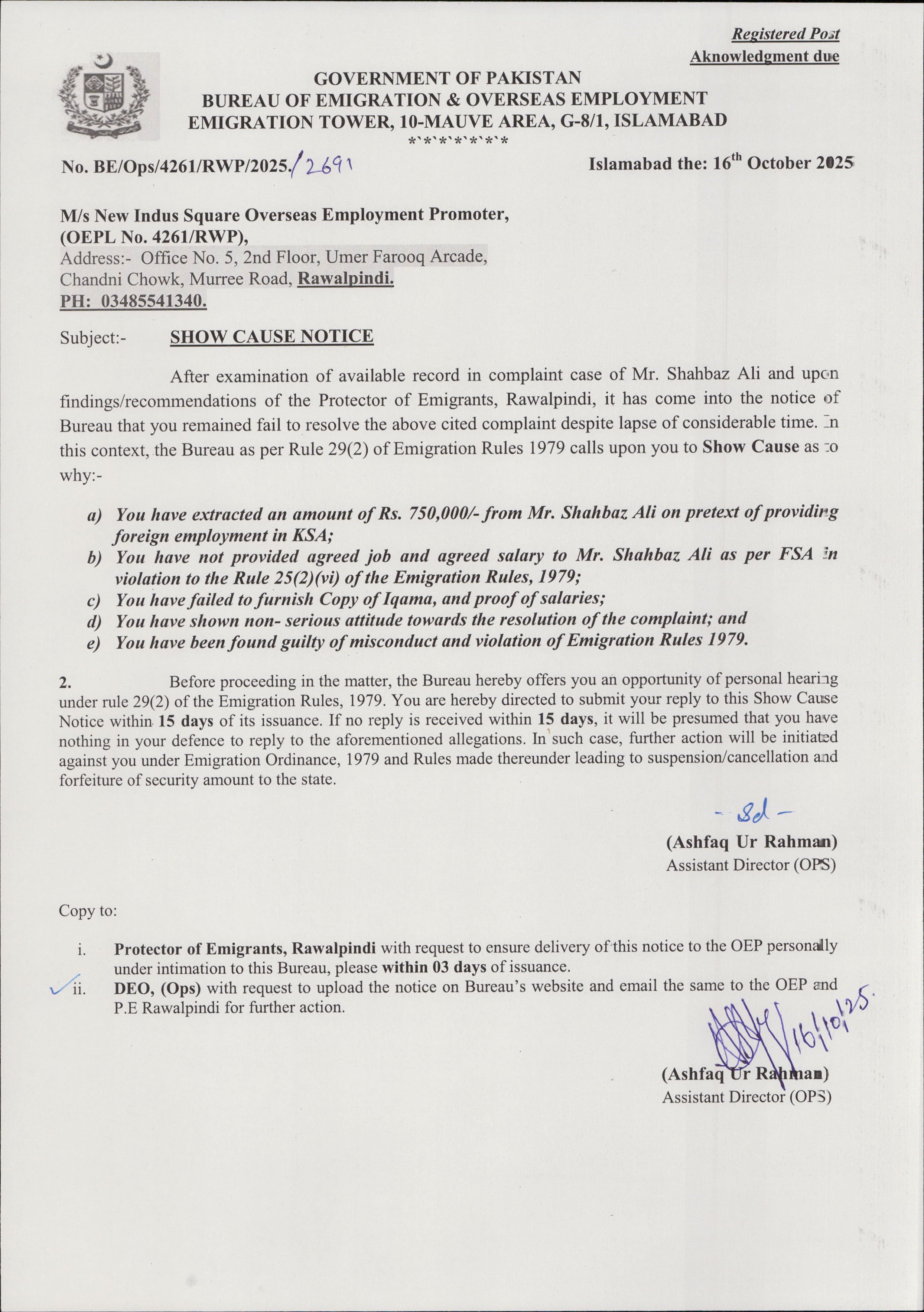 Show Cause Notice To M/s.New Indus Square Overseas Employment Promoter,OEPL No.4261/RWP Oct 16, 2025