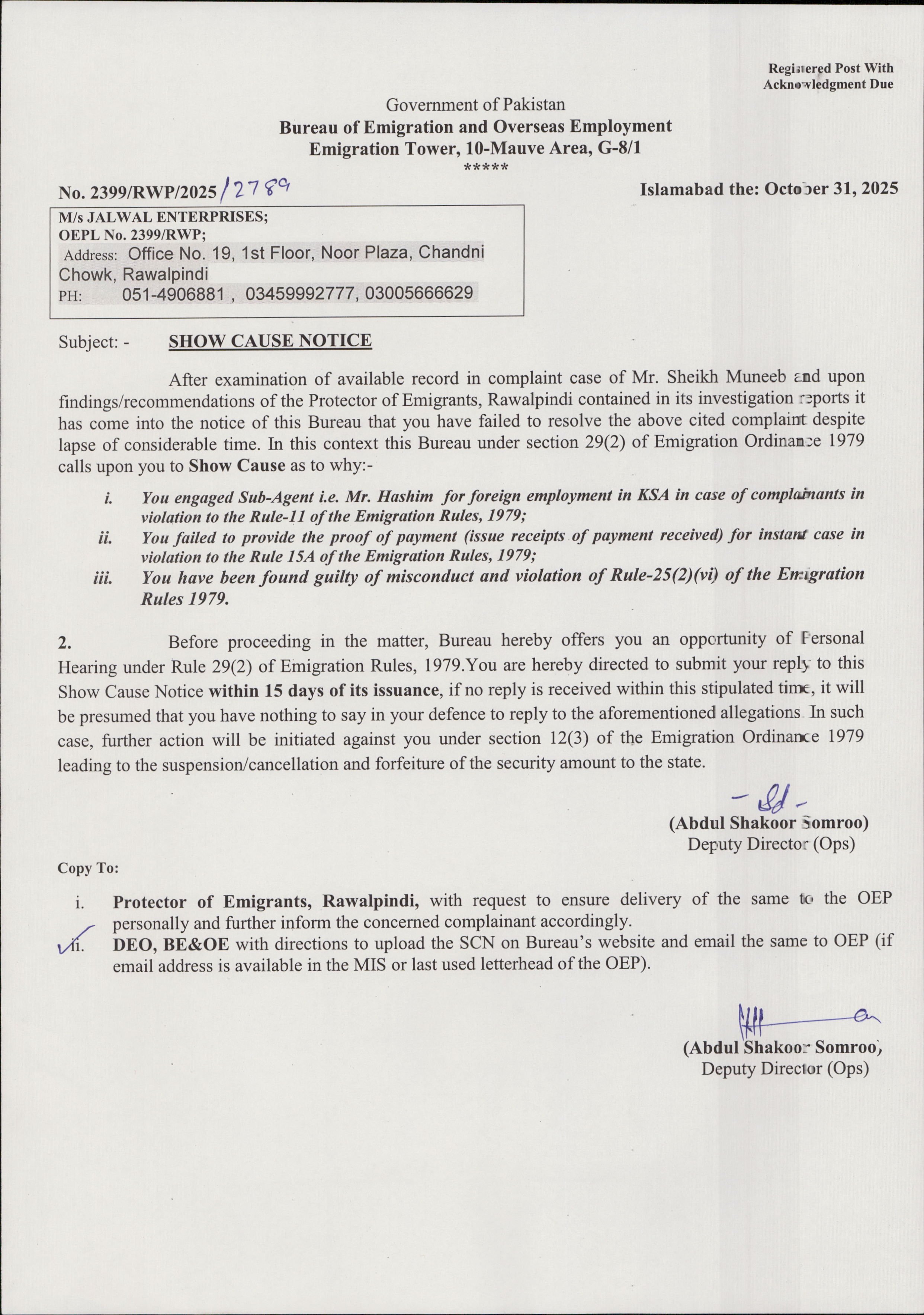 Show Cause Notice To M/s. Jalwal Enterprises,OEPL No.2399/RWP