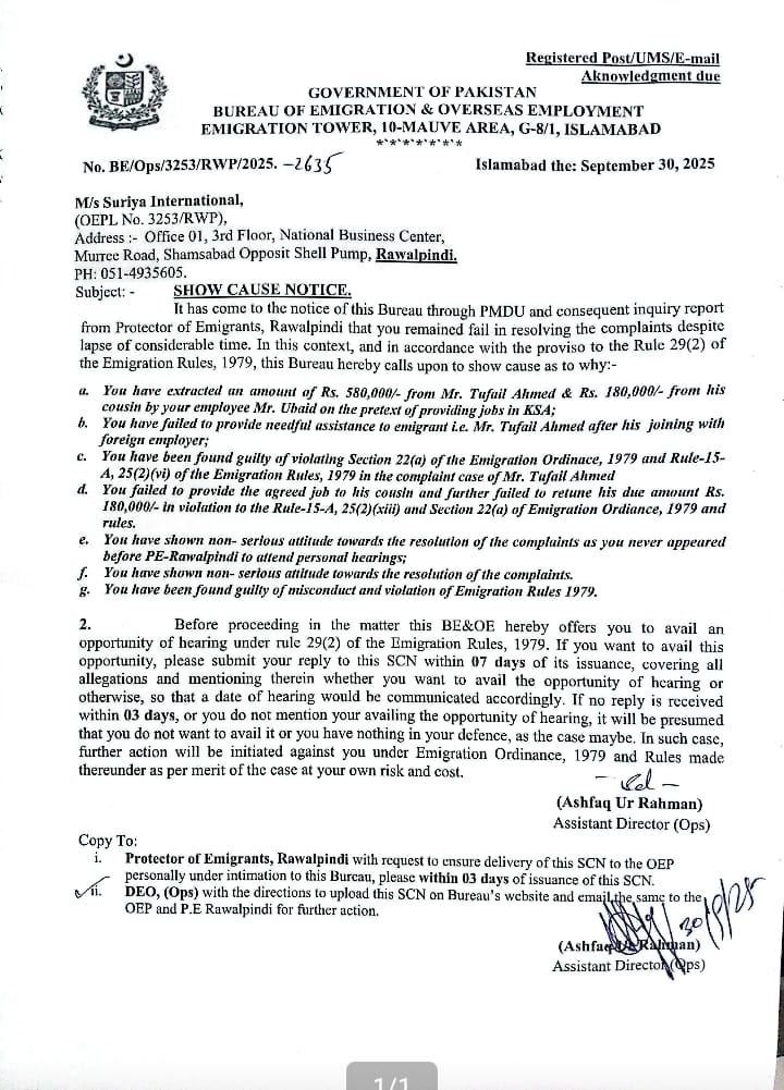Show Cause Notice - M/s. Suriya International OEPL No. 3253/RWP