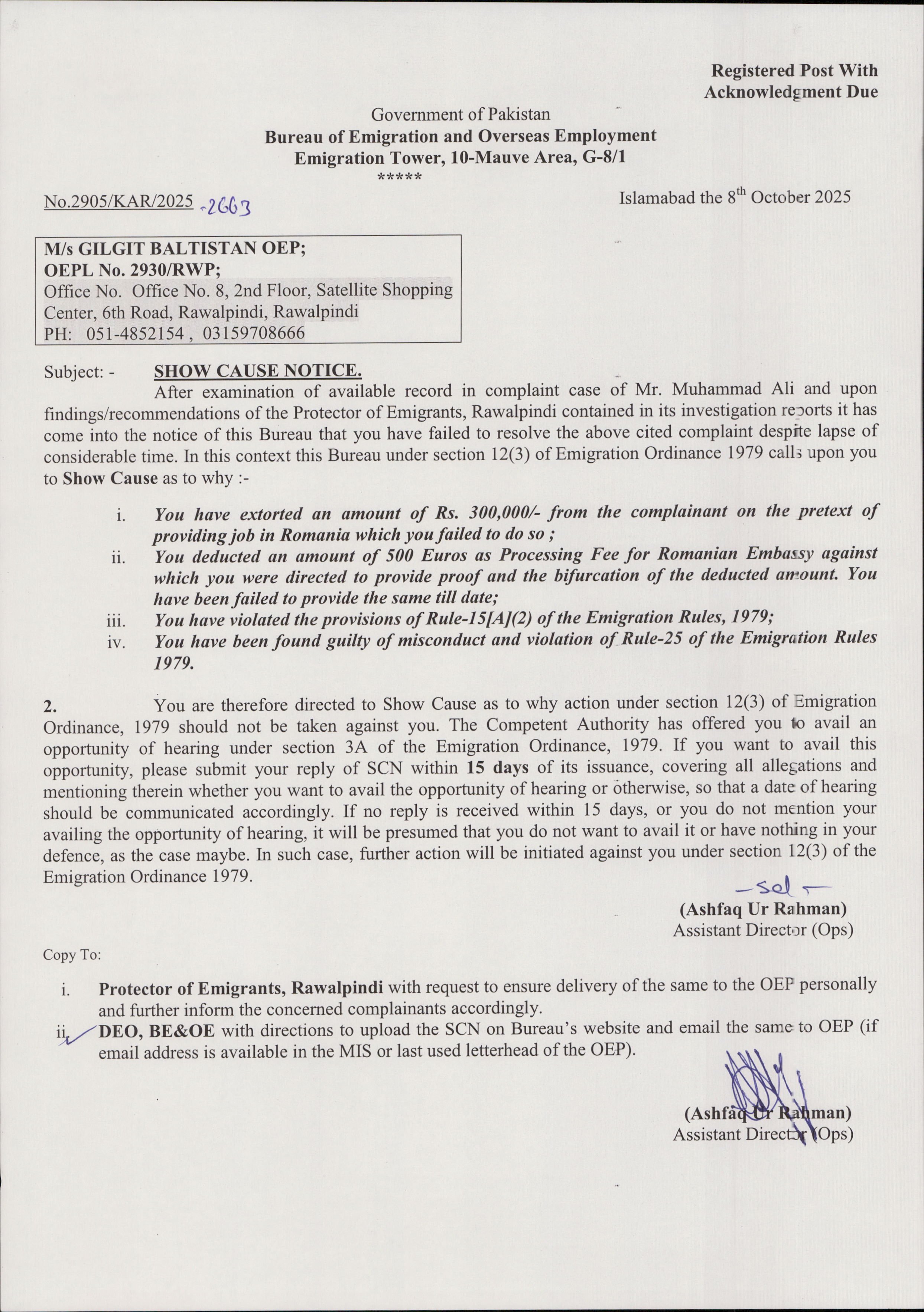 Show Cause Notice To M/s. Gilgit Baltistan OEP, OEPL No.2930/RWP Oct 8, 2025