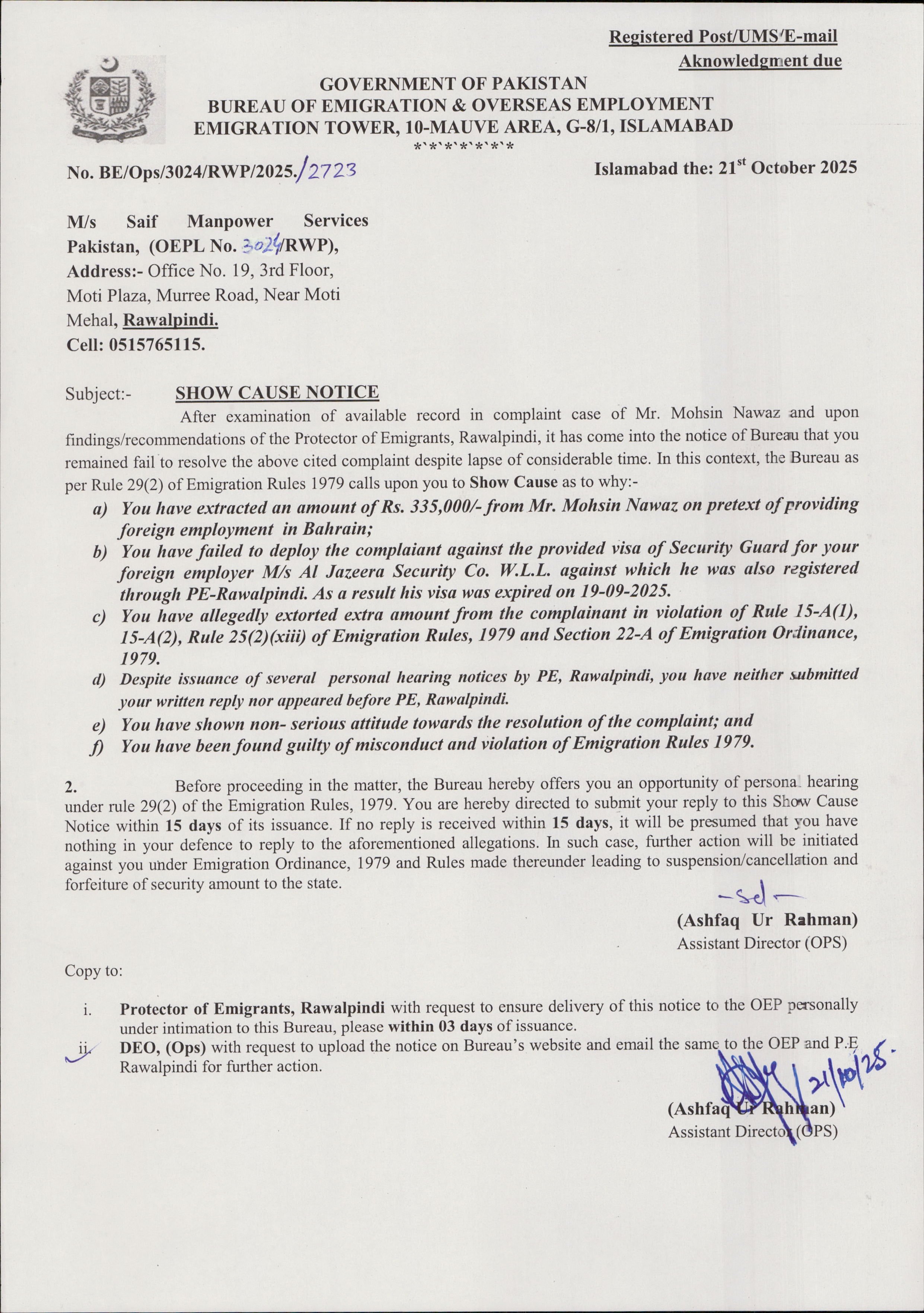 Show Cause Notice To M/s.Saif Manpower Services Pakistan,OEPL No.3024/RWP Oct 21, 2025