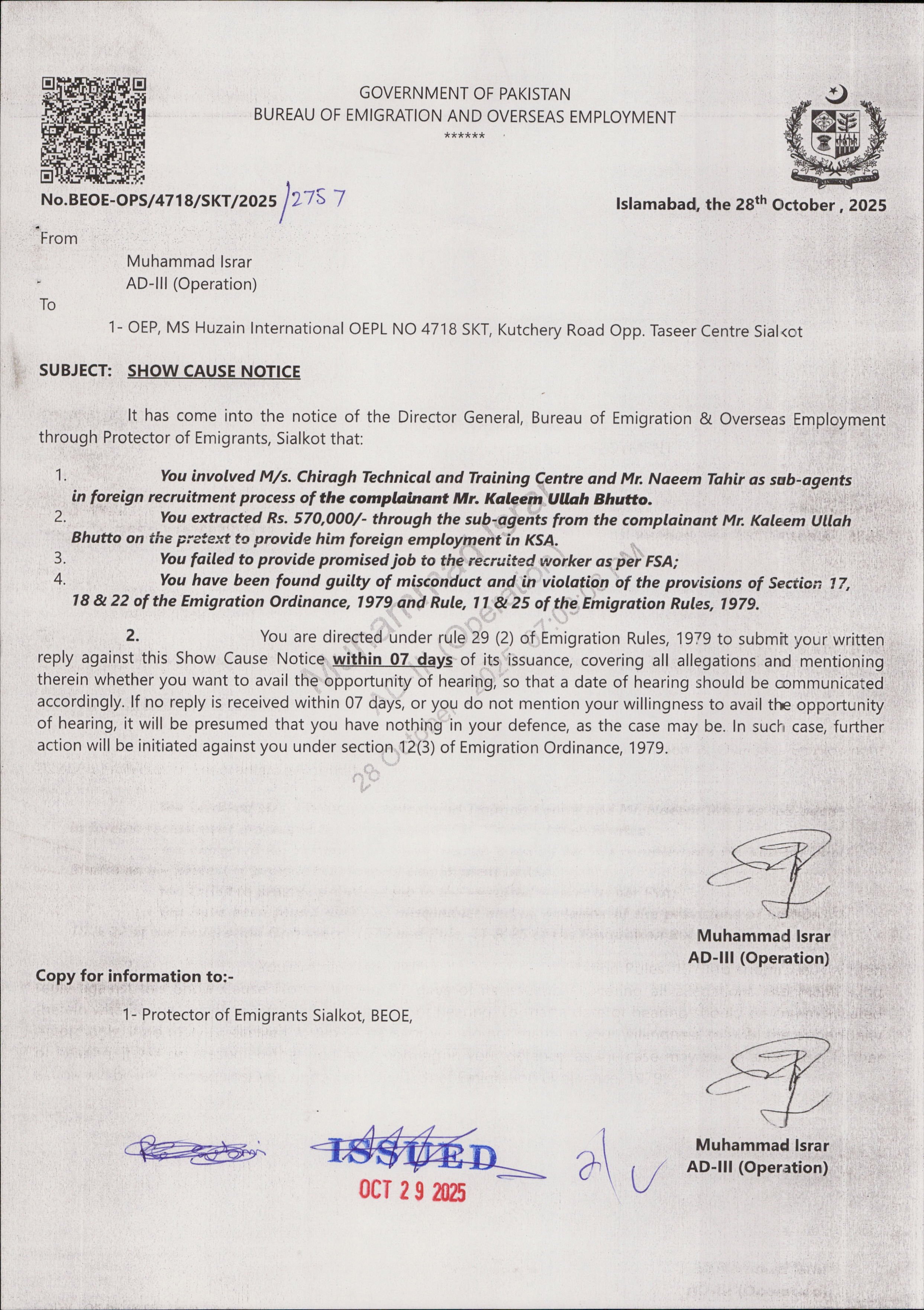 Show Cause Notice To M/s.Huzain International,OEPL No.4718/SKT Oct 28, 2025