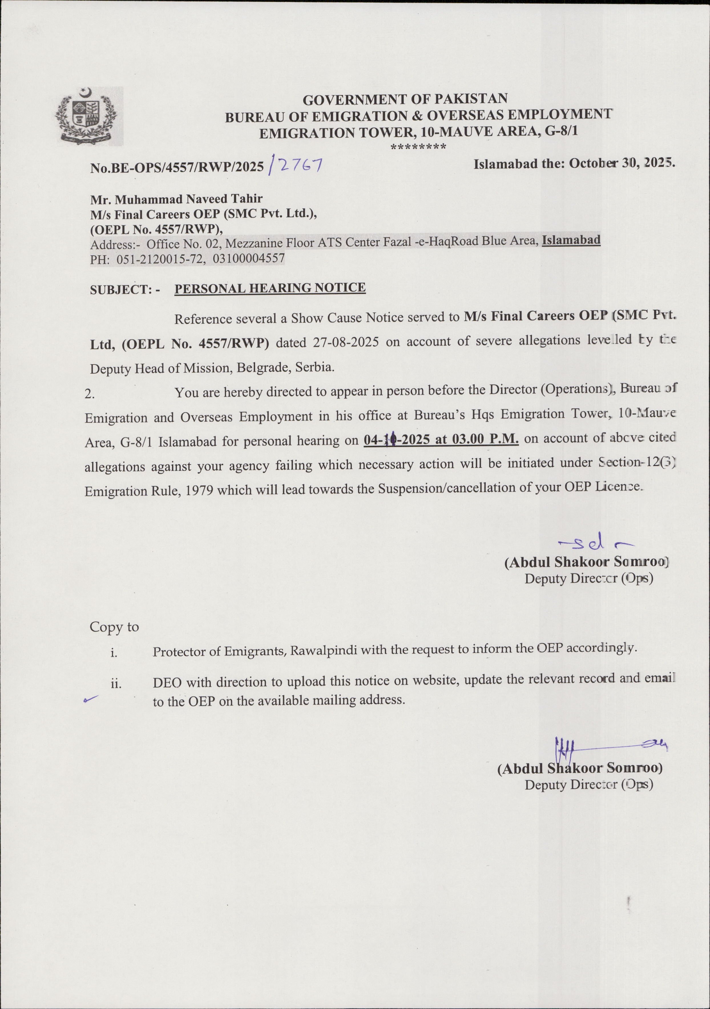 Personal Hearing Notice To M/s.Final Careers OEP (SMC Pvt Ltd),OEPL No.4557/RWP