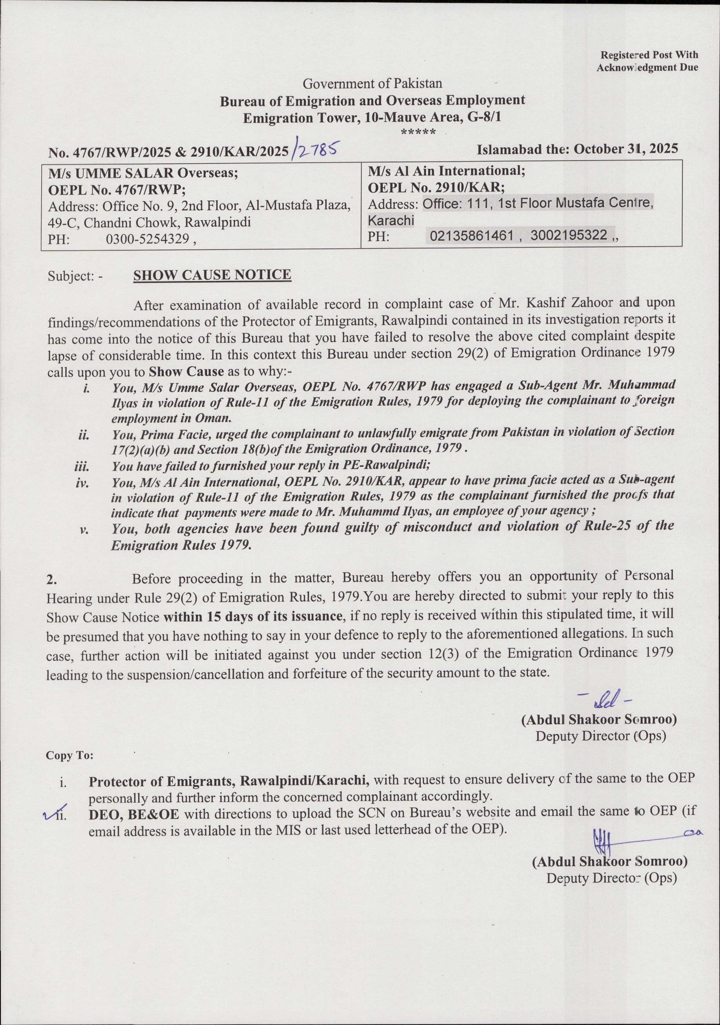 Show Cause Notice To M/s. Umme Salar Overseas,OEPL No.4767/RWP & M/s. Al Ain International,OEPL No.2910/KAR Oct 31, 2025